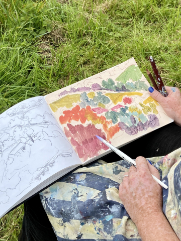 Each day began with Hugo giving a talk about the paintings of the Masters, encouraging the students to relate to the images in new ways. Outside the group experimented with using colour as a way to express their response to the landscape, distilling the morning’s talks into their experience.